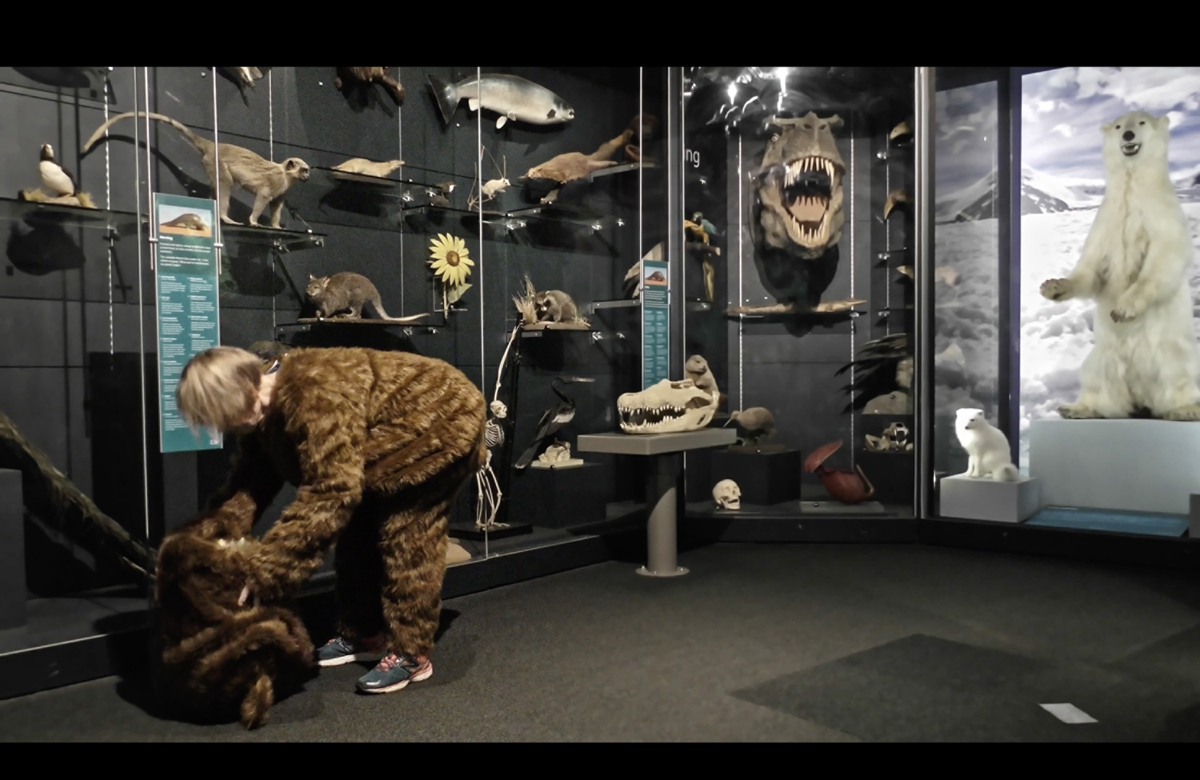 I purposefully use the bear costume to challenge my human movement and sensory abilities. Here, the bear rug. I have little to no view. My hearing is muffled. The costume is too large from some places. It’s too short from elsewhere. It’s too hot. The costume causes me to move in certain cautious and slow manner, in fear of pumping into the glass displays, tripping over the exhibits.